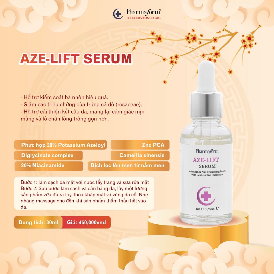 AZE-LIFT SERUM PHARMAFORM Serum Kiềm Dầu - Giảm Mụn - Giảm Thâm Đỏ Giải pháp chăm sóc da khoa học từ Pharmaform - Chai 30ml - Sản phẩm của CTY Pharmaform - Mã vạch: 8936208390082 Giá bán lẻ: 450.000 vnđ/Chai- Quý khách có thể mua trực tiếp trên website hoặc liên hệ hotline 0909.927943 để được tư vấn chọn sản phẩm phù hợp