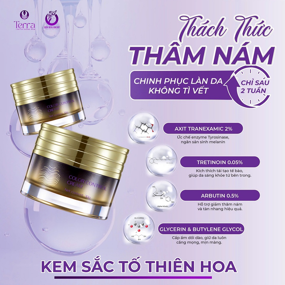 Giải pháp hàng đầu để loại bỏ thâm nám và đốm nâu phiền toái đó là Kem Sắc Tố Thiên Hoa Terra - một sự kết hợp hoàn hảo của các thành phần đ𝐢𝐞̂̀𝐮 𝐭𝐫𝐢̣ 𝐝𝐚 𝐡𝐚̀𝐧𝐠 đ𝐚̂̀𝐮 để mang lại cho bạn làn da sáng mịn, đều màu từ bên trong. 𝑨𝒙𝒊𝒕 𝑻𝒓𝒂𝒏𝒆𝒙𝒂𝒎𝒊𝒕 2%, 𝑻𝒓𝒆𝒕𝒊𝒏𝒐𝒊𝒏 0,05%, 𝒗𝒂̀ 𝑨𝒓𝒃𝒖𝒕𝒊𝒏 0,5% hoạt động để ức chế enzyme Tyrosinase, chịu trách nhiệm sản xuất hắc sắc tố Melanin 𝑮𝒍𝒚𝒄𝒐𝒍𝒊𝒄 𝑨𝒄𝒊𝒅 𝒗𝒂̀ 𝑪𝒚𝒄𝒍𝒐𝒊𝒄 𝑨𝒄𝒊𝒅 giúp loại bỏ tế bào da cũ, tái tạo tế bào mới, giảm thiểu thâm nám 𝑨𝒒𝒖𝒂, 𝑷𝒓𝒐𝒑𝒚𝒍𝒆𝒏𝒆 𝑮𝒍𝒚𝒄𝒐𝒍, 𝑩𝒖𝒕𝒚𝒍𝒆𝒏𝒆 𝑮𝒍𝒚𝒄𝒐𝒍: Đảm bảo độ ẩm cho da mềm mại và căng tràn sức sống. 𝑪𝒂𝒑𝒓𝒚𝒍𝒊𝒄/𝑪𝒂𝒑𝒓𝒊𝒄 𝑻𝒓𝒊𝒈𝒍𝒚𝒄𝒆𝒓𝒊𝒅𝒆, 𝑮𝒍𝒚𝒄𝒆𝒓𝒊𝒏, 𝑮𝒍𝒚𝒄𝒆𝒓𝒚𝒍 𝑺𝒕𝒆𝒂𝒓𝒂𝒕𝒆, 𝑷𝑬𝑮-100 𝑺𝒕𝒆𝒂𝒓𝒂𝒕𝒆: Cung cấp dưỡng chất cần thiết để tái tạo làn da khỏe mạnh. 𝑷𝒊𝒅𝒐𝒃𝒆𝒏𝒛𝒐𝒏𝒆 4%: Bảo vệ da khỏi tác động có hại của tia UV Với sự kết hợp độc đáo của các thành phần cùng công nghệ nano hoàn toàn mới, chỉ sau 2 tuần sử dụng, bạn sẽ chứng kiến sự biến đổi ngoạn mục trên làn da của mình. Đ𝒂́𝒏𝒉 𝒕𝒉𝒖̛́𝒄 𝒏𝒈𝒂𝒚 𝒗𝒆̉ đ𝒆̣𝒑 𝒕𝒖̛̣ 𝒏𝒉𝒊𝒆̂𝒏 & 𝒕𝒓𝒂̃𝒊 𝒏𝒈𝒉𝒊𝒆̣̂𝒎 𝒔𝒖̛̣ 𝒕𝒖̛̣ 𝒕𝒊𝒏 𝒗𝒐̛́𝒊 𝒍𝒂̀𝒏 𝒅𝒂 𝒔𝒂́𝒏𝒈 𝒎𝒊̣𝒏 & đ𝒆̂̀𝒖 𝒎𝒂̀𝒖 𝒏𝒂̀𝒏𝒈 𝒏𝒉𝒆́